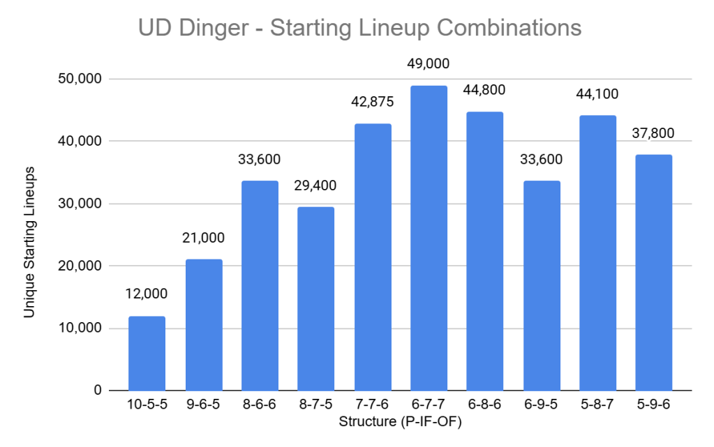 One quick note, flipping the IF and OF values results in the same number of unique starting lineups. For example, both a 6-8-6 and 6-6-8 structure would result in 44,80 unique starting lineups.