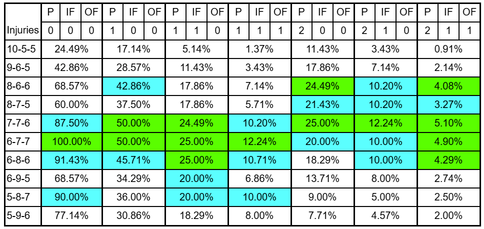 However, the math starts to change once injuries start to hit. I reran each structure with various injury scenarios, and then divided the result by 49,000 (the most possible lineups, a fully healthy 6-7-7 roster). For each injury scenario, I highlgihted the best structures in green, and reasonably close structures in blue.